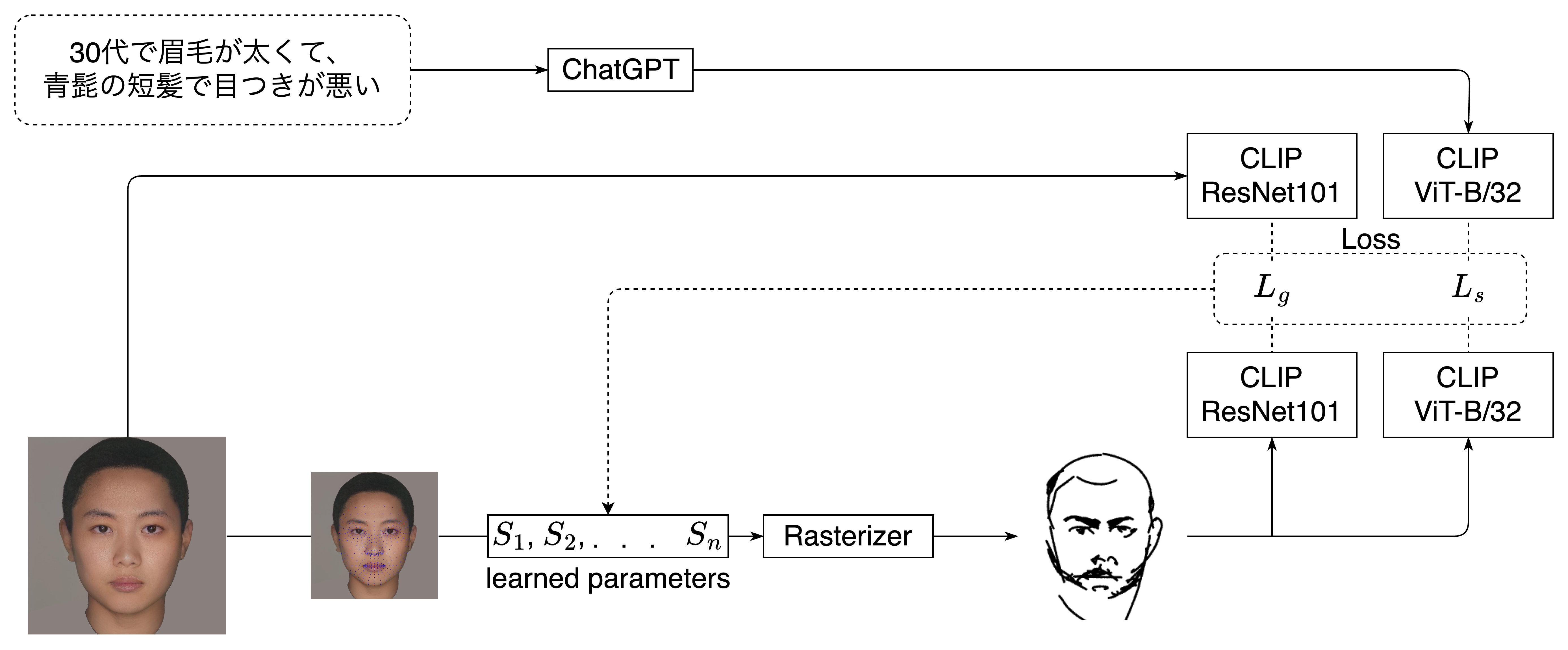 犯罪捜査の現場において,容疑者に関する目撃証言の共有は極めて重要である.目撃者たちの記憶を歪め ることを避けるため,近年ではリアルなモンタージュ写真よりもスケッチ画像(似顔絵)が使用されるようになって きた.しかし,目撃証言から容疑者の顔を正確にスケッチすることは,すべての捜査員にとっては難しい課題である. 言語的な証言から正面顔のスケッチ画像を生成するシステム(CLISOTS: CLIP based Semantic Oriented Testimony to Portrait Sketch)を提案する.このシステムは,目撃証言に含まれる抽象的な顔特徴の表現を,逐次的に顔スケッチ画 像に反映させることを可能にしている.