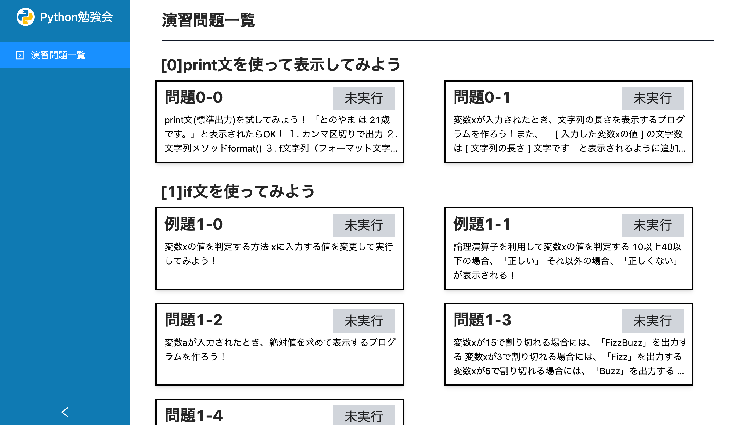 プログラミング言語の勉強会の主催者が参加者の実行したプログラムのコードや実行結果をリアルタイムで確認することができ、参加者はWebアプリ上でプログラムの実行ができるため環境構築が不要で正解・不正解などの結果を確認できるWebアプリ
